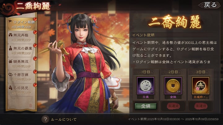 期間中は、ログイン報酬や武将を使ったミッションなど、様々なキャンペーンが実施されます。