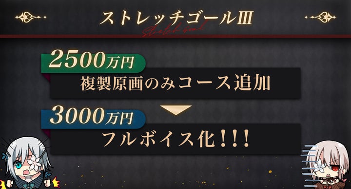 公式番組内での支援額300%突破、翌日には人気ランキング1位を獲得し400%を達成、フルボイス化を実現。