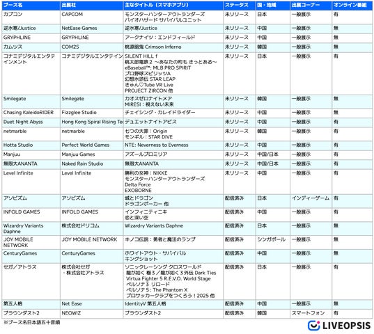 スマホゲームを中心に、企業やタイトルの出展ブースを調査し、展示の詳細や施策内容をまとめています。