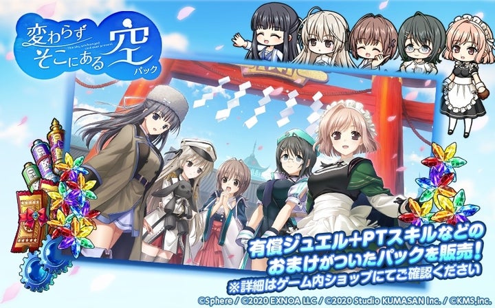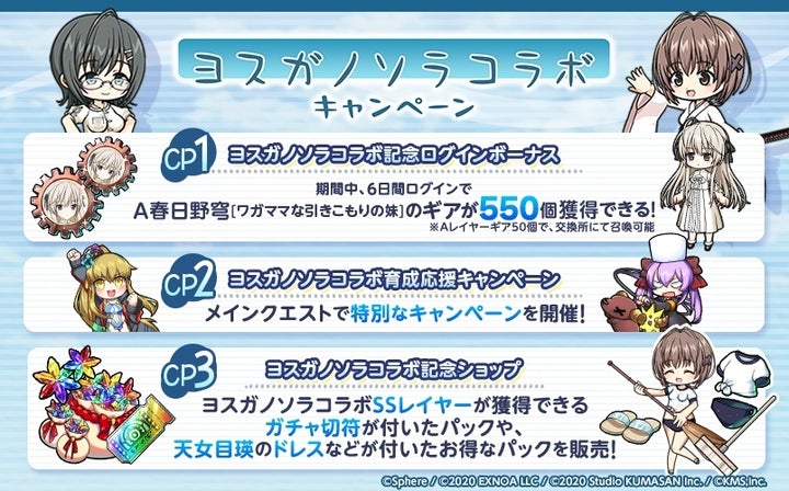 ガチャでは『ヨスガノソラ』のキャラクターが登場し、イベントでは限定装備やガチャ切符を入手できる。