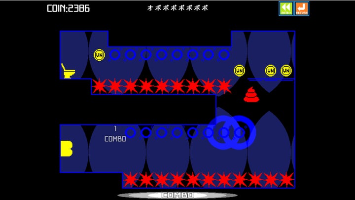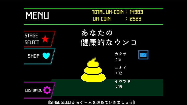 ゲームは、ネオンの世界でウンコを便器に導く高難易度2Dアクションで、ジャンプ操作のみで150以上のステージを攻略。