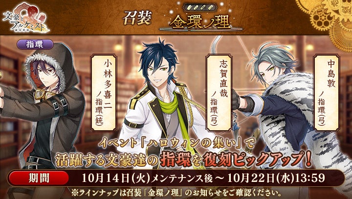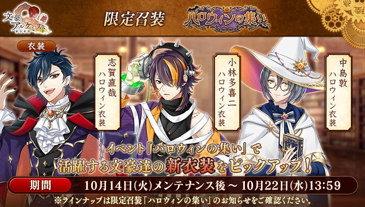 - 「文豪とアルケミスト」でイベント『調査任務「ハロウィンの集い」』と限定召装が開催。