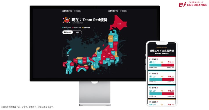 独自の特許出願中のシステムで充電データをスコア化し、都道府県ごとの勝敗を決定する。