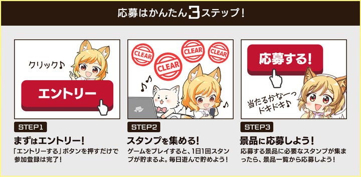 PCブラウザ、スマホブラウザ、GAMESストア版Androidアプリ、PCダウンロード版で配信中のゲームをプレイすることでスタンプを獲得し、スタンプ数に応じて景品に応募できる。