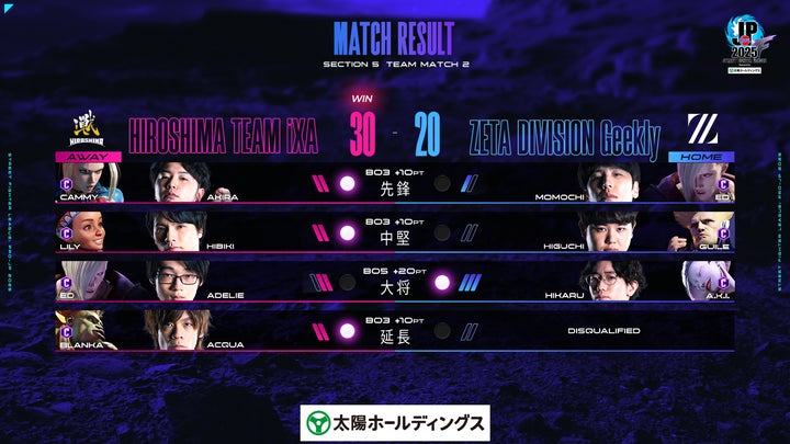 広島 TEAM iXA対ZETA DIVISION Geeklyでは、ひかる選手が勝利し、延長戦は広島 TEAM iXAが不戦勝で勝利しました。
