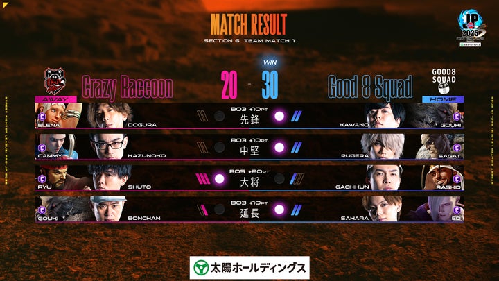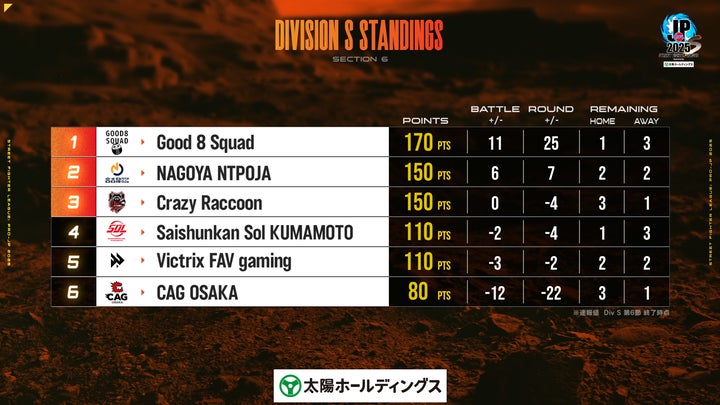 - Good 8 SquadがCrazy Raccoonに勝利し首位を守る。