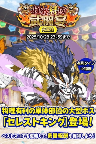 - 新イベント「極致絆成武闘宴」が開催、光属性ボスに挑戦しハイスコアを目指す。