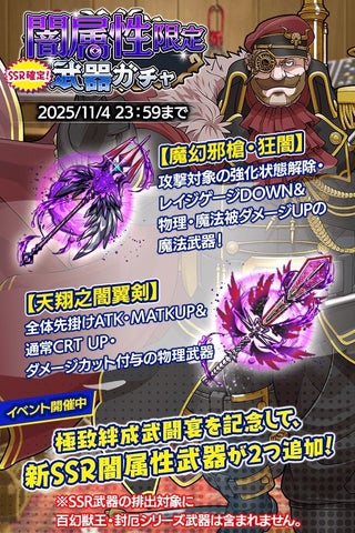 また、闇属性限定武器ガチャや『極致絆成武闘宴武器ガチャ』も登場。