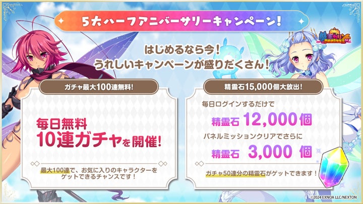 - 5大ハーフアニバーサリーキャンペーンとして、ガチャ最大100連無料、精霊石12000個プレゼント、フルボイス特別イベントクエストなどが開催。