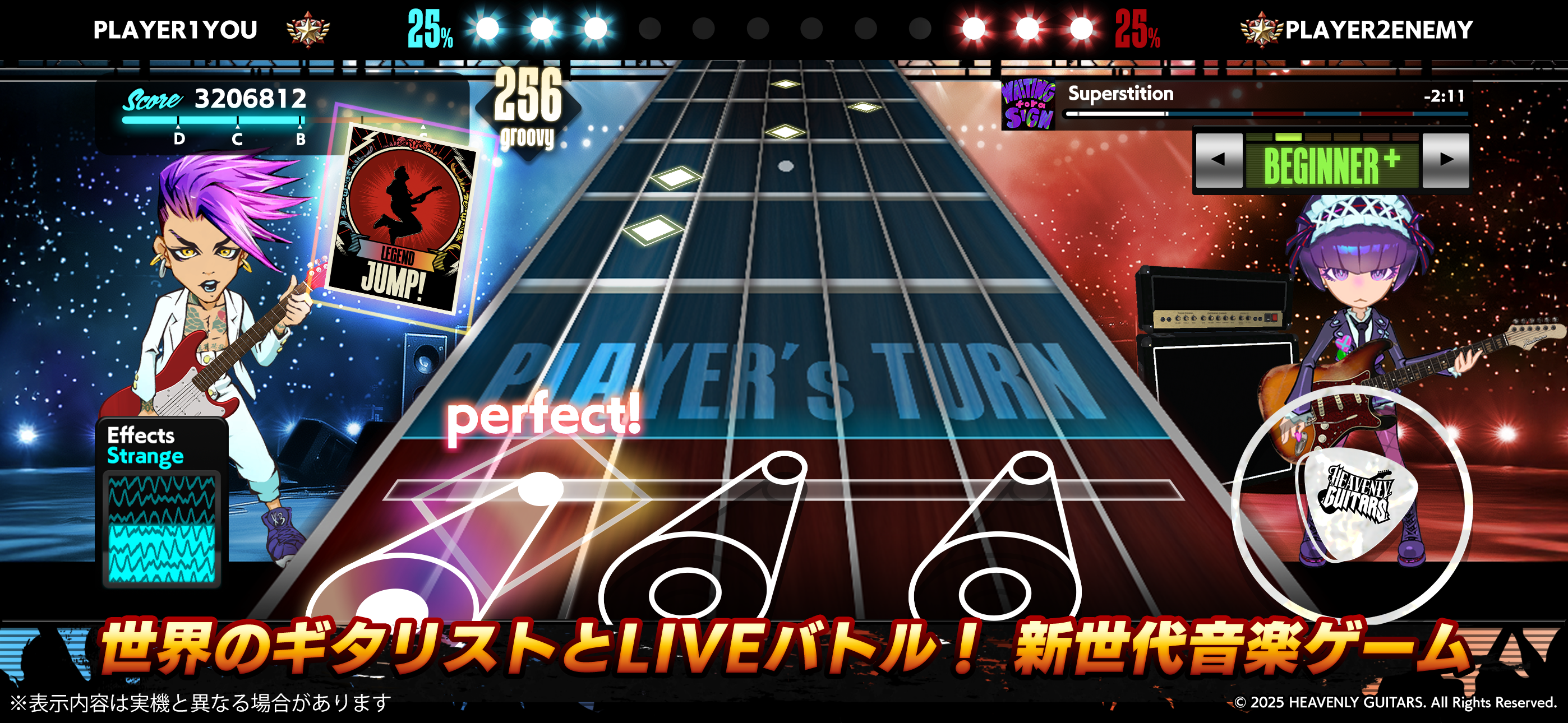 本作は、ギター奏法をモチーフにした独自の操作感とサウンド表現が特徴の対戦型音楽ゲーム。