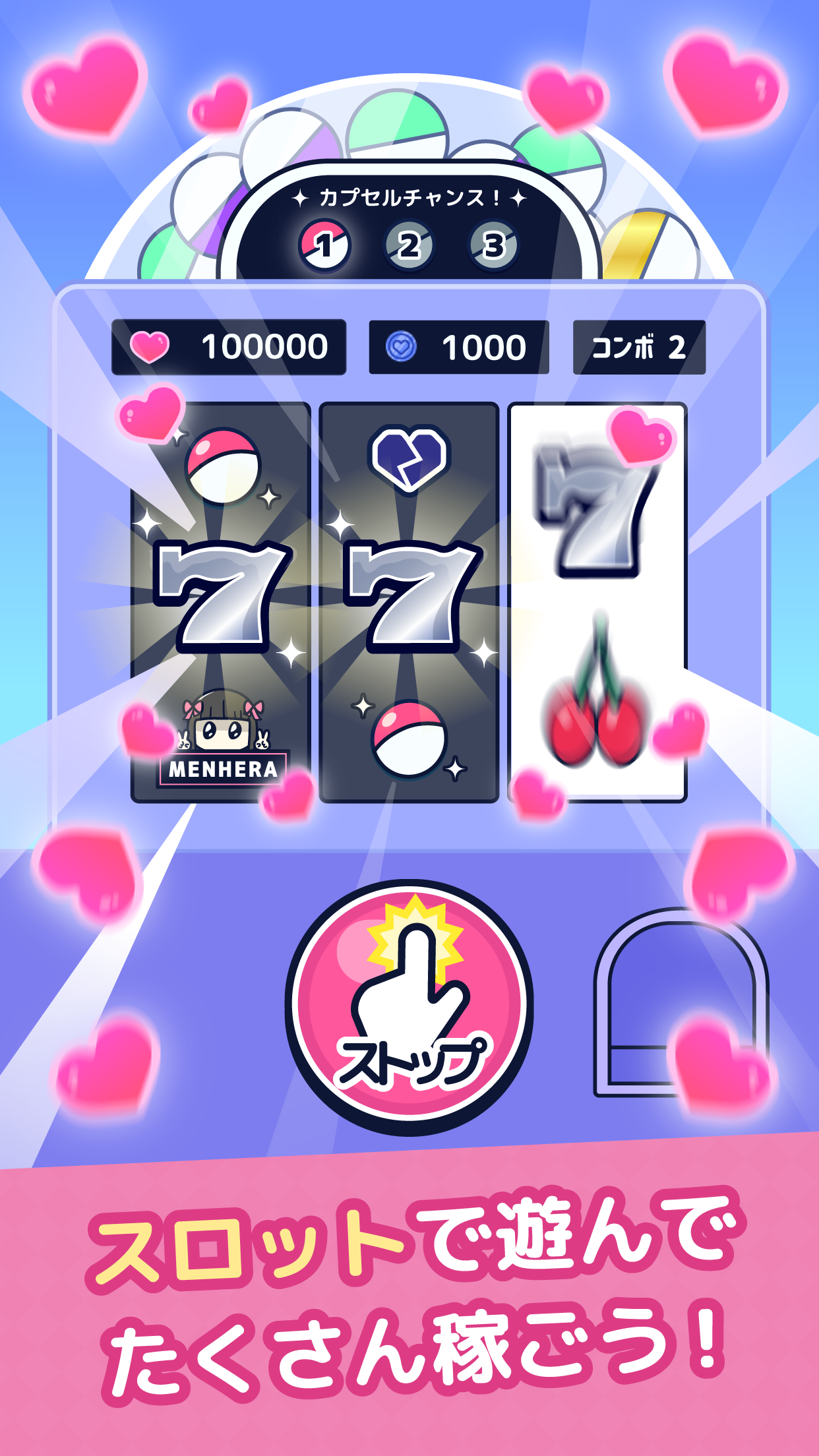 ハートを集めて彼女のメッセージに返信し、スロットやミニゲームで進化を促す。