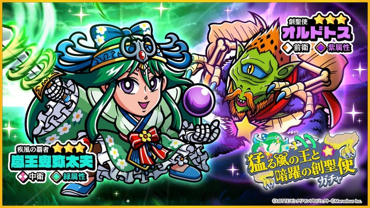 同時に、「猛る嵐の王と暗躍の創聖使ガチャ」も開始され、☆3キャラクター「[疾風の覇者]嵐王卑弥太夫」と「[創聖使]オルドトス」が登場、排出率がアップします。