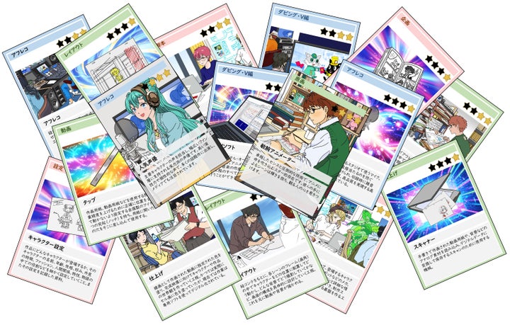 - ゲームを通じてアニメ制作工程を学習し、カードを集めてデッキを構築。