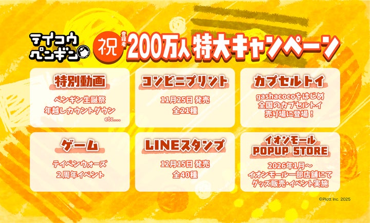 株式会社Plottが運営するショートアニメ『テイコウペンギン』が、YouTubeチャンネル登録者数200万人達成を記念して、「テイコウペンギン200万人特大キャンペーン」を開始。