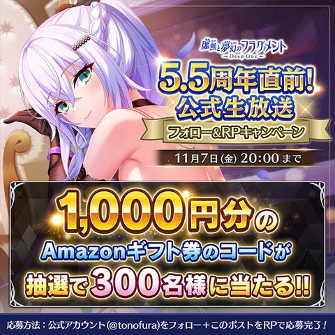 - 『Deep One 虚無と夢幻のフラグメント』の5.5周年記念生放送が11月7日に配信。