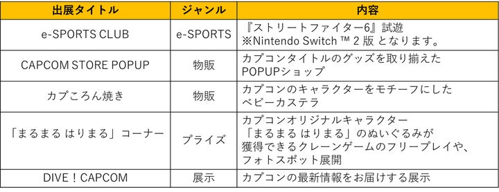 eSPORTSゲーム体験、最新情報展示エリア、オリジナルキャラクター「まるまる はりまる」関連企画、カプコンストアPOPUPショップ、ベビーカステラ販売など、多彩なブースを展開する。