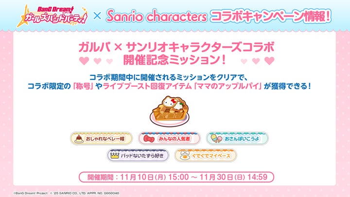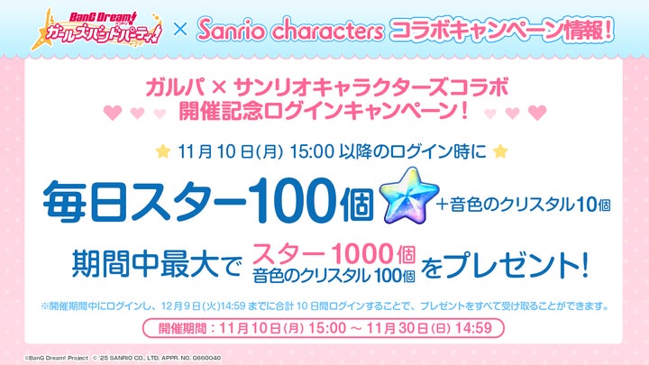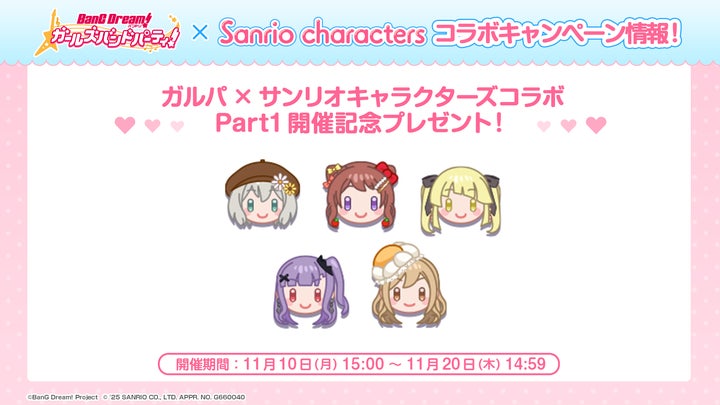 ガルパメンバー10人とサンリオキャラクターズがペアになったコラボが決定し、Part1は11月10日(月)15時、Part2は11月20日(木)15時より開催されます。