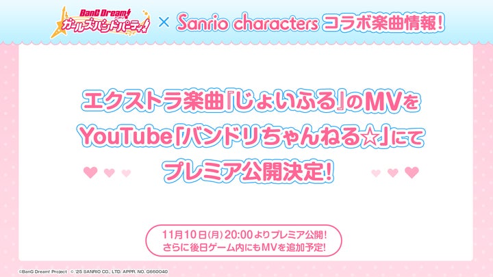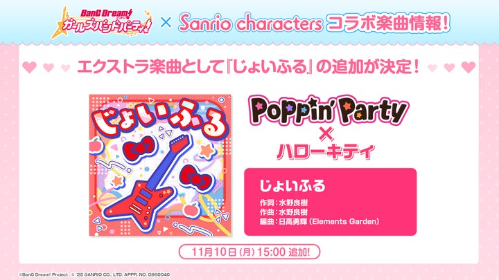また、Poppin’Partyとハローキティによるエクストラ楽曲『じょいふる』が追加され、11月10日(月)20時よりYouTubeでMVがプレミア公開されます。