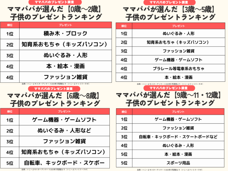 国内最大級の子供とお出かけ情報サイト「いこーよ」による、年齢別プレゼントランキング2025-2026の調査結果が発表されました。