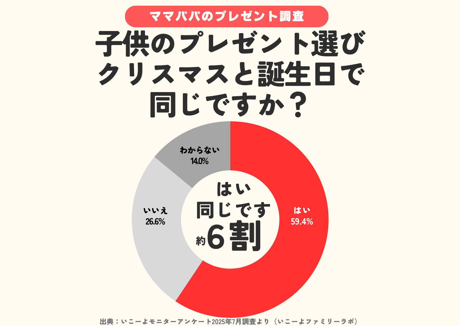 クリスマスプレゼントと誕生日プレゼントの違いについては、約6割が同じように選び、子供の希望を尊重し、親子の絆を深めるプレゼント選びがされているようです。