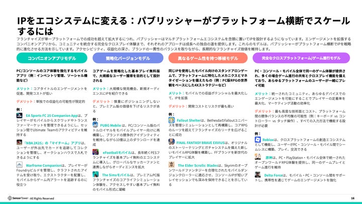 コンパニオンアプリ、簡易化バージョン、異なるゲーム性を持つ移植モデル、クロスプレイなど、様々なクロスプラットフォーム戦略が紹介されている。
