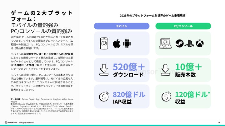モバイルは520億ダウンロードと820億ドルのIAP収益を、PC/コンソールは120億ドル以上の収益を生み出す。
