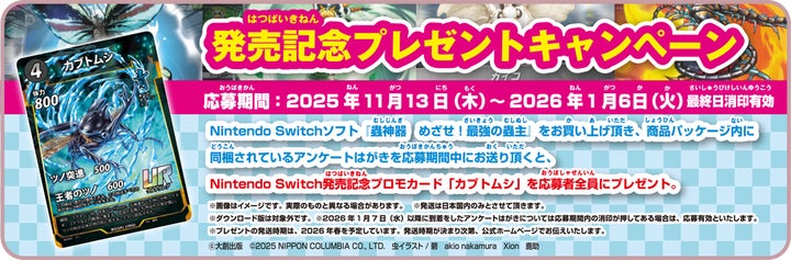 発売を記念して、プロモカード「カブトムシ」がもらえる応募者全員プレゼントキャンペーンも実施される。