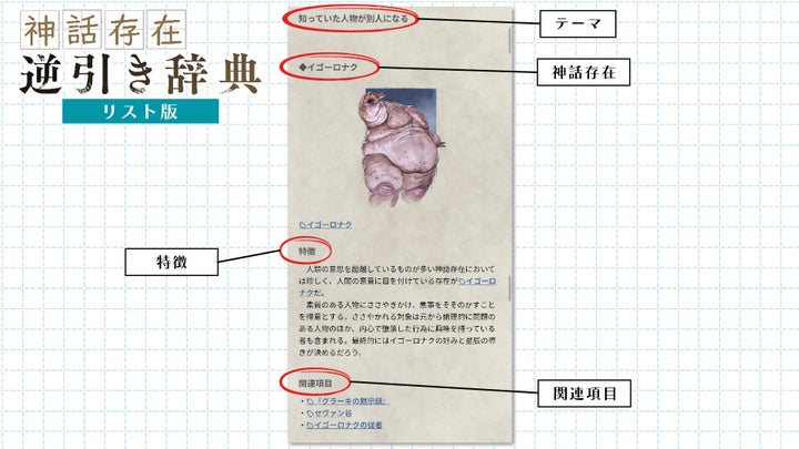 - 「神話存在逆引き辞典 β版」は、シナリオ制作者向けにテーマ別の神話存在を紹介。