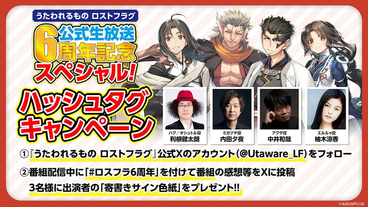 株式会社アクアプラスは、2025年11月22日(土)に「うたわれるもの 白への道標」公式生放送 最新情報公開SPと「うたわれるもの ロストフラグ」公式生放送 6周年記念スペシャル!を同日配信する。
