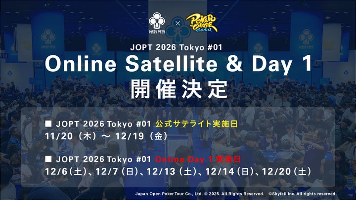 2025年11月20日~12月20日の期間、「ポーカーチェイス」アプリ内で、JOPT本戦に直結する「公式サテライト(予選)」と「JOPT 2026 Tokyo #01 Main Event Online Day 1(本選)」を開催する。