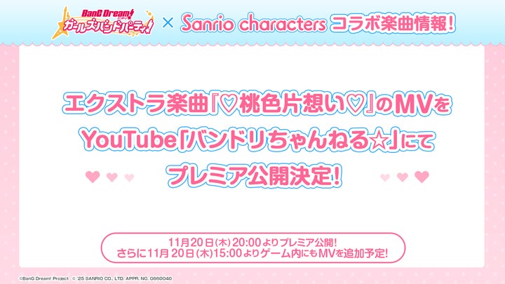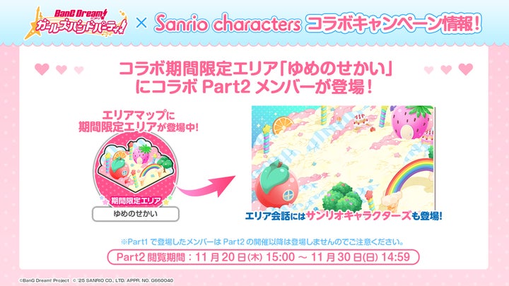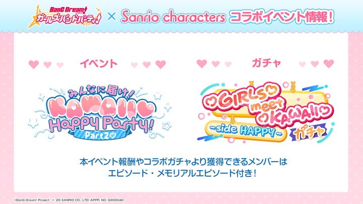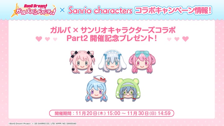 - 「ガルパ」とサンリオキャラクターズのコラボPart2が2025年11月20日(木)15時より開催。
