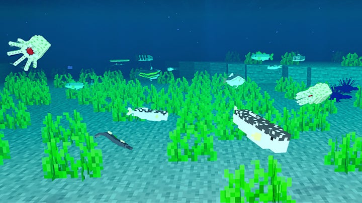 子どもたちは、教育版マインクラフトの専用ワールドで浜名湖を再現したゲームに参加し、アマモ植栽ミッションに挑戦。