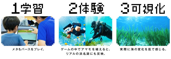 • 教育版マインクラフトで浜名湖を再現し、アマモ植栽を通してCO₂吸収に貢献。