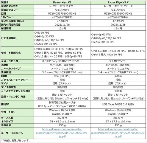 - Razerからストリーミング用Webカメラ「Razer Kiyo V2」と「Razer Kiyo V2 X」が発売。