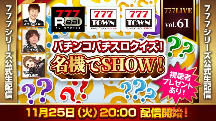 - 2025年11月25日(火)20時から「777LIVE Vol.61」を生配信。