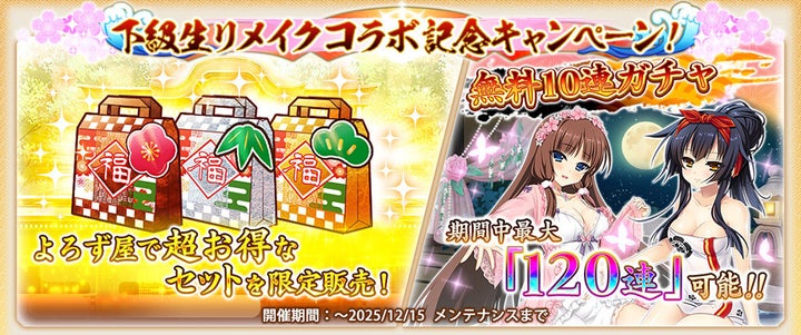 - 2025年12月3日から12月15日まで、最大120連無料ガチャ、コラボ限定パック販売、ログインボーナスを実施。