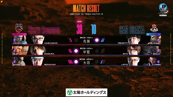 - Crazy RaccoonがCAG OSAKAに勝利しプレイオフ進出決定。