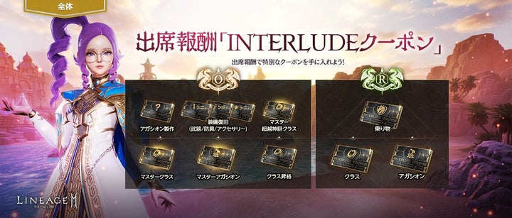 また、出席報酬「INTERLUDEクーポン」や「黄金の馬車商団」イベントも開催される。