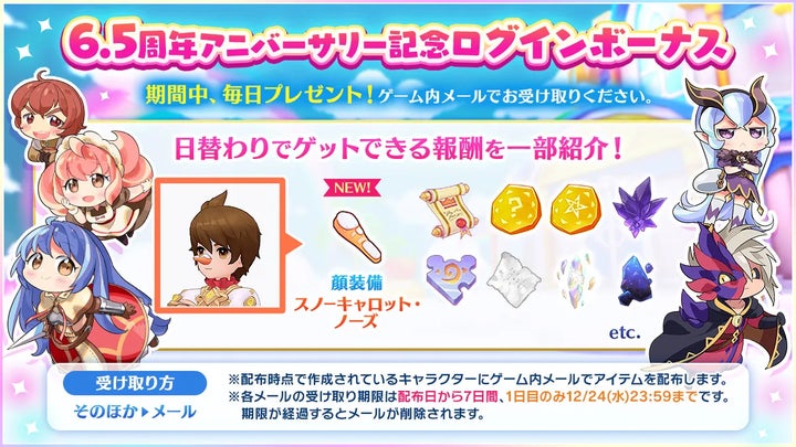 「カウントダウンログインボーナス」や「6.5周年アニバーサリー記念ログインボーナス」を実施し、新顔装備「スノーキャロット・ノーズ」などの豪華報酬を獲得できる。