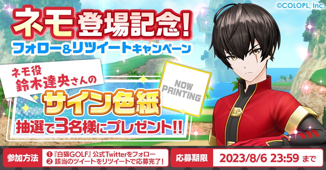 株式会社コロプラは、スマートフォン向けゲーム『白猫GOLF』に新ゴルファー「ネモ(CV:鈴木 達央)」が登場しました。