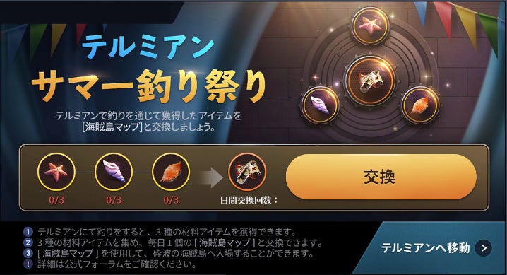 - テルミアンサマーマーケット、テルミアン釣り、砕波の海賊島、テルミアンサマー釣り祭り、テルミアン週間ミッション