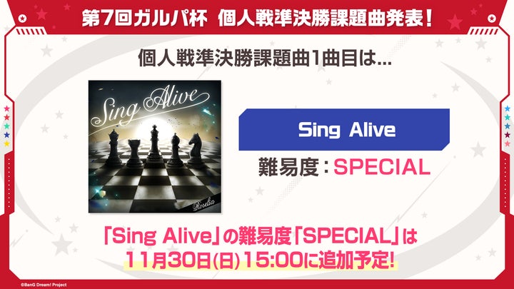 第7回ガルパ杯では、個人戦準決勝1曲目に『Sing Alive』の難易度「SPECIAL」が決定しました。