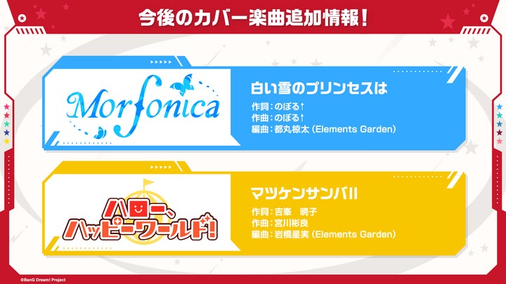 - Morfonicaによる『白い雪のプリンセスは』、ハロー、ハッピーワールド!による『マツケンサンバⅡ』がカバー楽曲として追加。第7回ガルパ杯情報も発表。