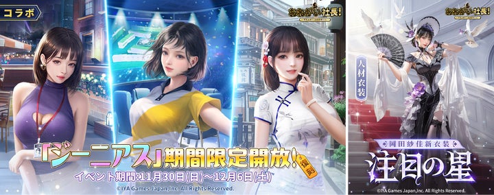 スマートフォン向けゲーム「おねがい社長!」が、プロ雀士の岡田紗佳、伊達朱里紗、瀬戸麻衣の3名とのコラボレーションを2025年11月29日(土)から12月25日(木)まで開催。