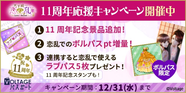 また、ボルテージの無料会員ポイントサイト「VOLTAGEパスポート」でも、11周年応援キャンペーンが開催され、ポイント増量やラブパスプレゼントなどの特典があります。