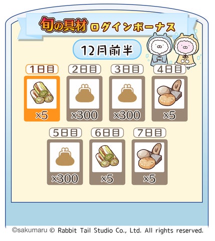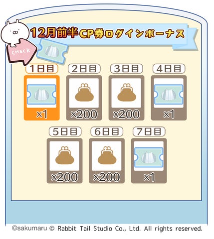 さらに、12月前半限定ステージで役立つ旬の具材が手に入るログインボーナスや、CP券が獲得できるログインボーナスも開催される。