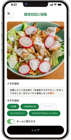 - アプリは、栽培提案、クエスト、EC連携、AIアドバイス、レシピ紹介など、都市農を総合的にサポート。