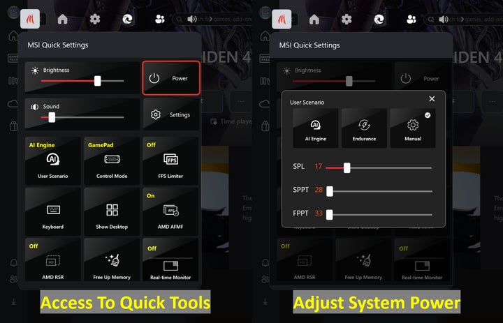 MSIクイックセッティングがXbox Game Barに統合され、ワンタッチでパフォーマンス設定や各種機能にアクセスできる。