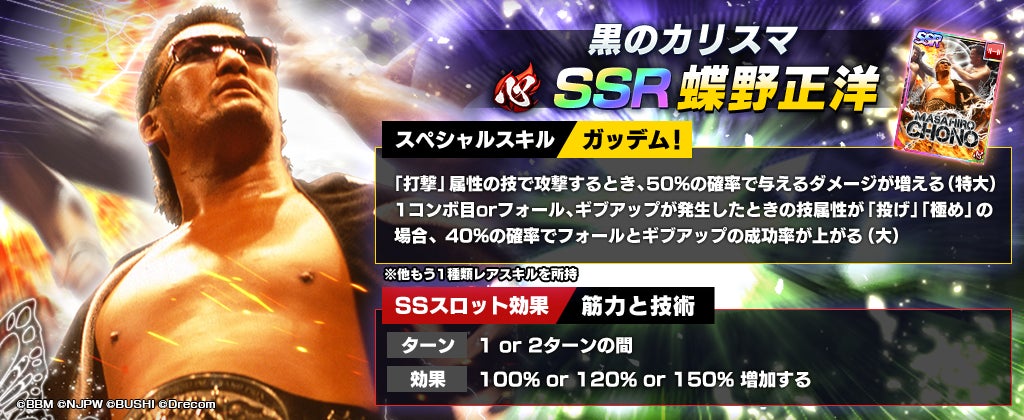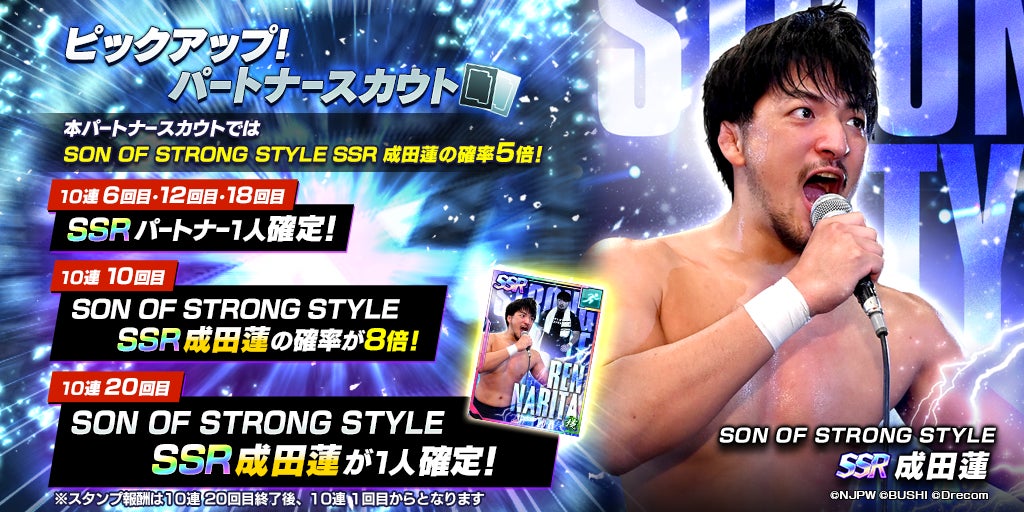 株式会社ブシロードと株式会社ドリコムが共同開発したスマートフォンゲームアプリ『新日本プロレスSTRONG SPIRITS』(以下、新日SS)に、新たなSSRパートナーが登場しました。