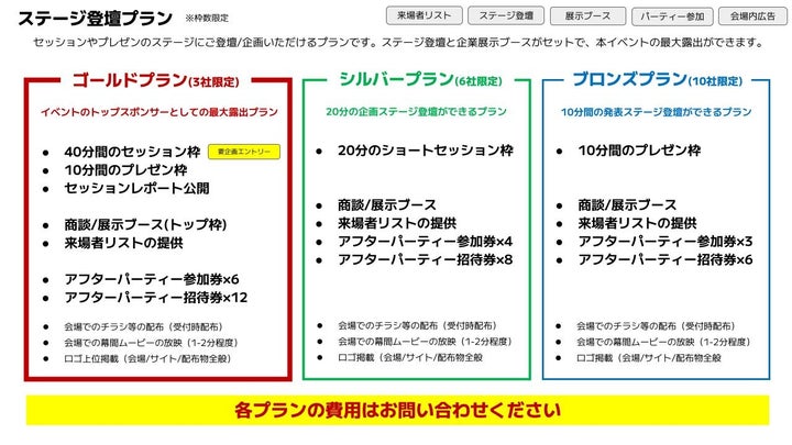 ステージ登壇、企業展示ブース、会場ブランディング/プロモーションなど、多様な協賛メニューが用意されています。